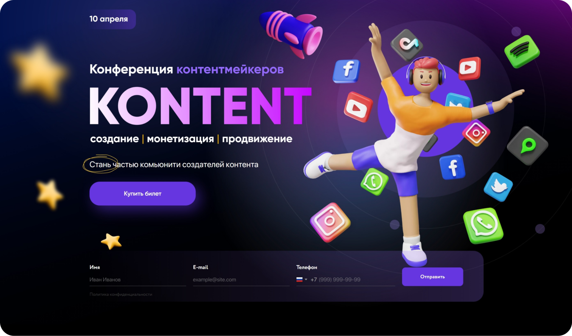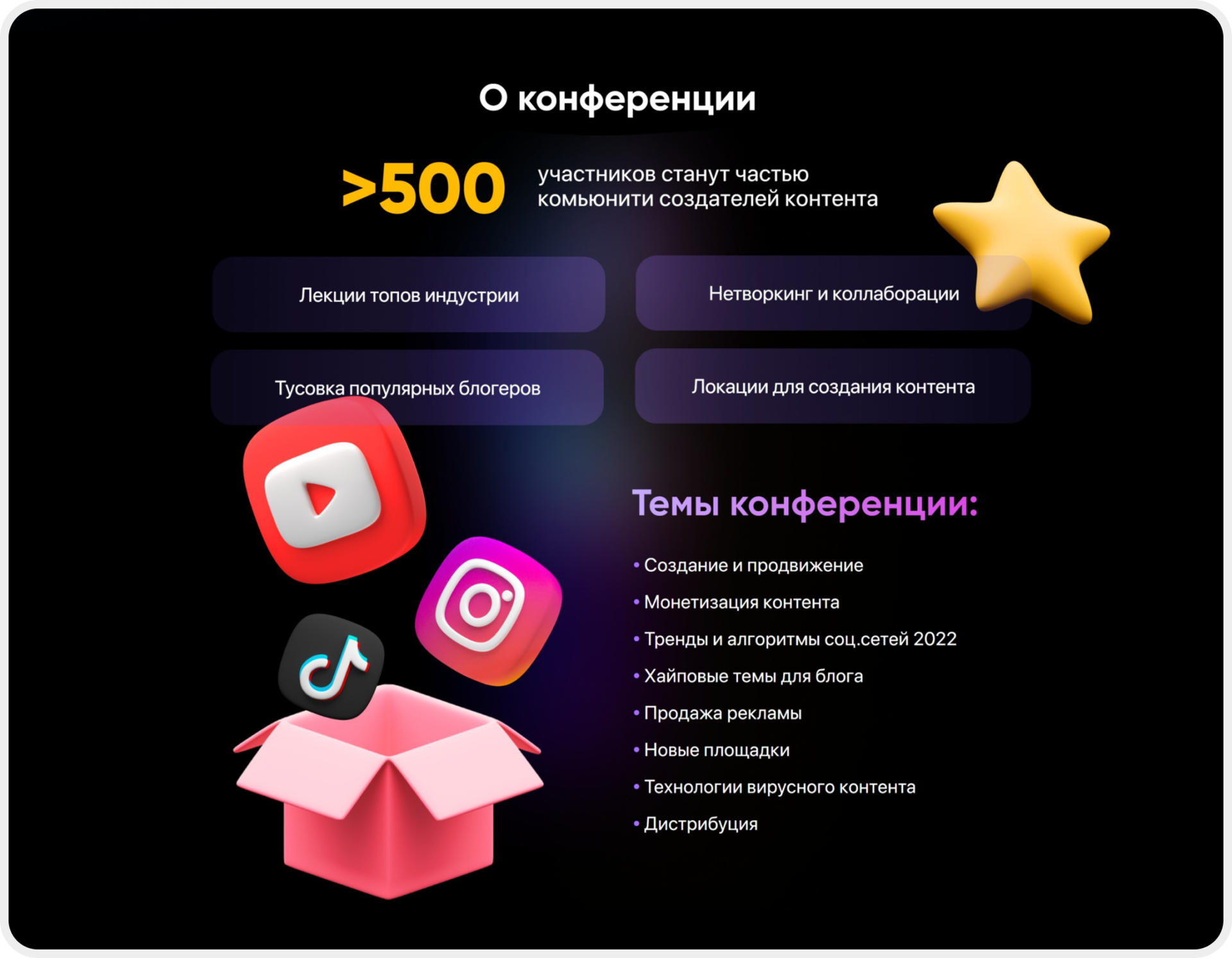 KONTENT — образовательная бизнес-конференция о создании, монетизации и продвижении контента на популярных площадках от ArGon Promo. Это уникальная отраслевая образовательная программа, а также площадка для объединений и коллабораций представителей индустрии.