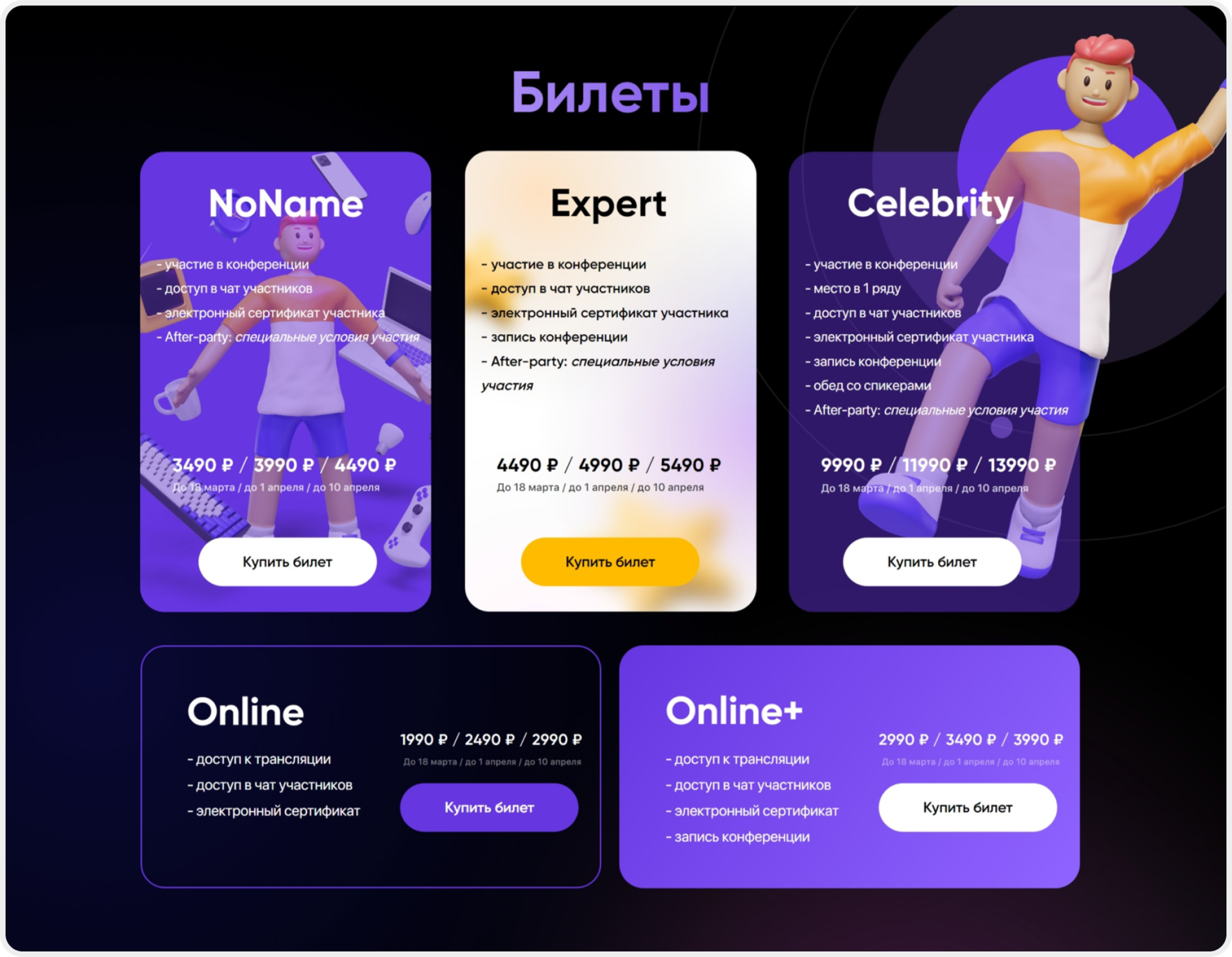 На сайте есть 7 основных разделов, которые подробно описывают, для кого конференция и что на ней будет, кто будет выступать, какое расписание и стоимость билетов. Разделы интуитивно понятные и читаемые, а для быстрого перемещения по сайту предусмотрена навигация.