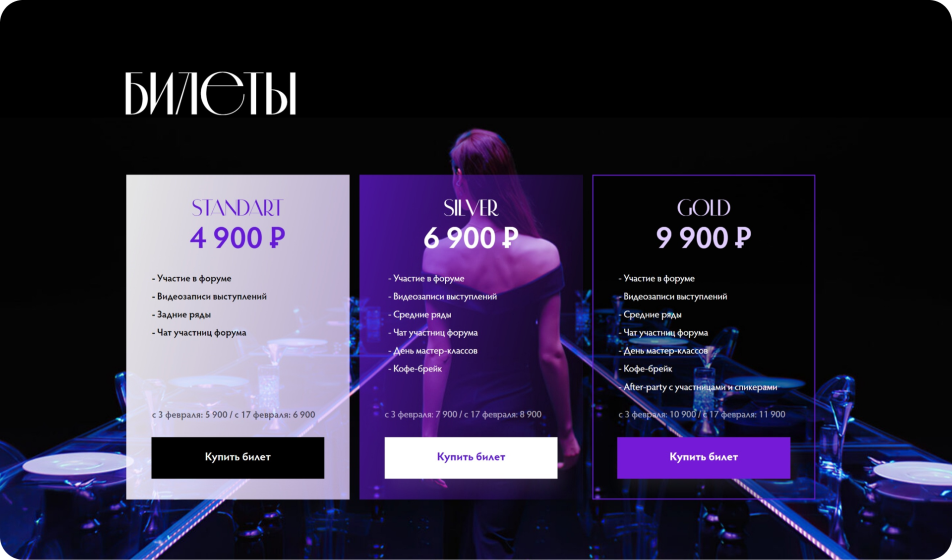 На сайте есть 7 основных разделов, которые подробно описывают, для кого конференция и что на ней будет, кто будет выступать, какое расписание и стоимость билетов. Разделы интуитивно понятные и читаемые, а для быстрого перемещения по сайту предусмотрена навигация.